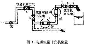 a,b,e為不宜位置(b處可能液體不充滿,a和e處易積聚氣體,且 e處傳感器后管段短也有可能不充滿);對(duì)于固液兩相流來(lái)說(shuō)c處亦是不宜位置。