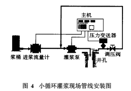 小循環(huán)灌漿法的實(shí)質(zhì)是: a泵的吸入量主要由返漿量提供,返漿量的大小由高壓調(diào)節(jié)閥控制,鉆孔灌漿注入量=流量計(jì)量(見(jiàn)圖4);b流量計(jì)大部分時(shí)間工作在1/3量程之下,相當(dāng)長(zhǎng)的時(shí)間內(nèi)工作在1L/min左右;c返漿漿液不返回?cái)嚌{桶,水泥漿液只能在閉合的管道中循環(huán),漿桶內(nèi)調(diào)節(jié)水灰比對(duì)灌漿漿液的密度影響甚微。