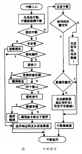 在HART通信中,鉆井泥漿流量計作為從設(shè)備進行通訊,所以這里的軟件設(shè)計只是針對于從設(shè)備。HART通信采用水平和垂直校驗的方法。當(dāng)檢測到接收數(shù)據(jù)有差錯時,則等到主設(shè)備命令幀發(fā)完后,通知主設(shè)備數(shù)據(jù)接收有誤。主設(shè)備則重新發(fā)命令幀,從而保證通信的準確可靠。HART中斷子程序流程圖如圖6所示。由于HART通信為主從方式,HART幀中每個字節(jié)在物理層傳輸需要9ms左右,為了保證通訊的實時性,通訊程序采用串行口終端接收/發(fā)送。該中斷所要完成通信中的主要任務(wù),即接收和發(fā)送幀,幀的拆分和打包。