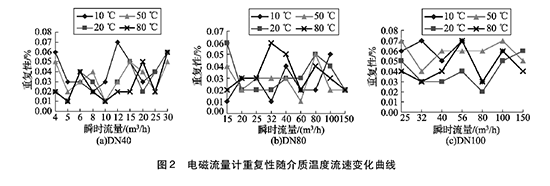 將實(shí)驗(yàn)測(cè)得的給排水流量計(jì)在不同溫度及流速下的重復(fù)性數(shù)據(jù)整理,特性曲線如圖2所示,3組曲線分別對(duì)應(yīng)DN40, DN80, DN100的3塊給排水流量計(jì)的重復(fù)性曲線。