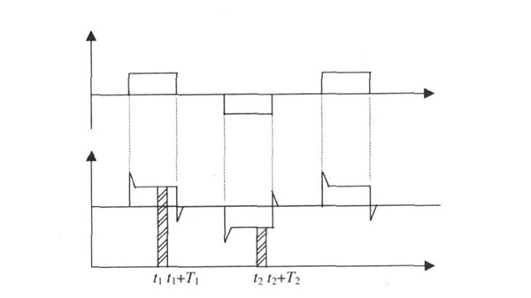 景觀給水流量計(jì)一般都采用工頻交流電源供電, 其電源電壓的幅值和頻率的變化都會(huì)給景觀給水流量計(jì)帶來(lái)電源性干擾噪聲。對(duì)電源電壓的幅值變化, 因采用多級(jí)集成穩(wěn)壓, 一般而言電源電壓的幅值變化對(duì)電磁流量的測(cè)量精度影響不大。當(dāng)電源電壓的頻率波動(dòng)時(shí), 雖然其波動(dòng)范圍有限, 但對(duì)景觀給水流量計(jì)測(cè)量精度影響較大。為了解決工頻干擾問題, 實(shí)現(xiàn)對(duì)流體流速感應(yīng)電勢(shì)eab信號(hào)的準(zhǔn)確測(cè)量, 需利用以下基本關(guān)系:①勵(lì)磁周期為工頻周期的整數(shù)倍, 即勵(lì)磁頻率為50/nHz(n為偶數(shù));②正負(fù)勵(lì)磁下的同相位采樣。圖2是對(duì)應(yīng)低頻矩形波勵(lì)磁形式下的典型電勢(shì)信號(hào)形式, 按上述關(guān)系在一個(gè)勵(lì)磁周期下, 若假設(shè)t1 和t2 點(diǎn)為工頻干擾的等效干擾點(diǎn), 且采樣寬度T=T1 =T2 , 則eab的基本算式為: