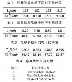 仿真試驗中,設定線圈等效電感取值范圍為 162~212mH,間隔 10mH;閉合回路等效電感范圍 0.2~1mH,間隔為 0.2mH;雙電層電容、接觸電阻隨流體電導率變化而變化,電導率增大接觸電阻和雙電層電容減小而電荷傳遞電阻增大??稍O定電極接觸電阻、雙電層電容和電荷傳遞電阻范圍分別為 5~15kΩ、10~20μF 和50~60Ω,由公式(7)知,可用 T2 表示上述三者關系。 仿真參數(shù)取值不同情況下,通過 MATLAB 工具箱對仿真測量得到的干擾峰值進行曲線擬合畫出相應的曲線圖。 其中仿真數(shù)據(jù)和相對應的曲線方程如表 1~表 4 所示,曲線圖如圖 4~圖 6。