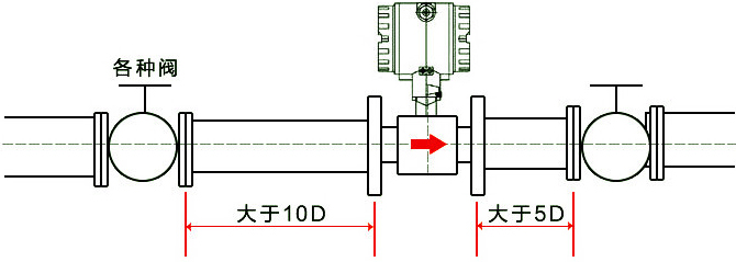 1、對(duì)直管段的要求:必須水平安裝在管道上(管道傾斜在5以?xún)?nèi)),安裝時(shí)流量計(jì)軸線(xiàn)應(yīng)與管道軸線(xiàn)同心,流向要一致。上游管道長(zhǎng)度應(yīng)有不小于2D的等徑直管段,如果安裝場(chǎng)所充許建議上游直管段為20D、下游為5D。