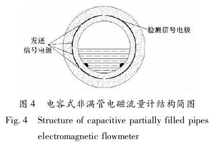 ②電容式非滿管污水廠出水用電磁流量計(jì)h。電容式非滿管污水廠出水用電磁流量計(jì)結(jié)構(gòu)簡(jiǎn)圖如圖4所示。、檢測(cè)信號(hào)電極  發(fā)送信號(hào)電