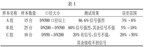 通過大量的在線檢測試驗,可以看出所測管道管徑對超聲流量計測試效果有明顯影響。根據(jù)數(shù)據(jù)顯示,管徑越大,測試效果越好,示值誤差越小。隨著管徑的減小,超聲流量計所能檢測到的流速信號也隨著變?nèi)?,?dāng)口徑小于 DN50 時,基本沒有信號或是產(chǎn)生巨大的干擾信號。
