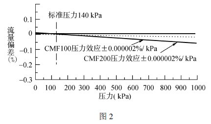 從圖2 中, 我們可以看出壓力對測量準確度的影響:當工藝壓力增大, 會使流量計產(chǎn)生一個負向偏差, 表現(xiàn)為流量顯示值比實際值偏小;當壓力減小時, 會使流量計產(chǎn)生一個正向偏差, 表現(xiàn)為流量顯示值比實際值偏大。