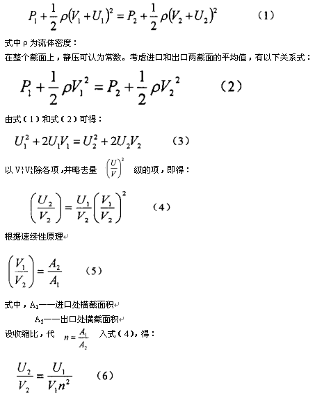 設(shè)整流器進(jìn)口處壓力為P1,平均流速為V1,某點(diǎn)上的速度不均勻度為U1,出口處壓力為P2,平均流速為V2,通過(guò)進(jìn)口處某點(diǎn)同**線,在出口處的速度不均勻度為U2,沿該流線,由伯努利方程得: