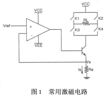 以往的激磁電路的設(shè)計都是采用恒流源和可控開關(guān)電路組成。恒流源是由電壓基準(zhǔn)、比較放大、控制調(diào)整和采樣等部分組成的直流負(fù)反饋自動調(diào)節(jié)系統(tǒng),常用的激磁電路就是用串聯(lián)調(diào)整型恒流電源盒控制開關(guān)組成的,如圖1。其中Vref是參考電壓,Rs是采樣電阻,Is為流過Rs的電流,就是所需的恒流,RL為電磁流量傳感器線圈,K1、K2、K3、K4為可控開關(guān),以達(dá)到使線圈RL中流經(jīng)正負(fù)交換的電流,對傳感器激磁。