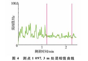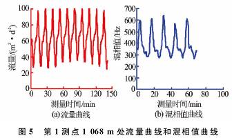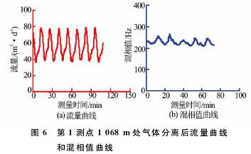 T-××-××1井是大慶油田采油五廠1口水驅(qū)產(chǎn)出井,采用阻抗式含水率計(jì)在該井進(jìn)行了測(cè)試。圖3、圖4分別為測(cè)點(diǎn)深度1097.3m測(cè)量的流量及混相值曲線圖。2min的采樣時(shí)間內(nèi),流量及混相值曲線波動(dòng)劇烈,明顯受井下產(chǎn)氣影響,進(jìn)行平均值計(jì)算時(shí)只能取后半段較平穩(wěn)的數(shù)據(jù),因此,測(cè)試時(shí)需延長(zhǎng)測(cè)量時(shí)間。錄取不同范圍數(shù)值時(shí)流量及含水率測(cè)量差值較大,流量平穩(wěn)段為14.81m3/d,高值時(shí)達(dá)到23.52m3/d;取不同測(cè)量段的混相值時(shí)測(cè)量含水率*大相差12%。重復(fù)測(cè)量得到了相同的測(cè)量結(jié)果。由此可見,氣體對(duì)流量及含水率測(cè)量產(chǎn)生了非常大的測(cè)量誤差。