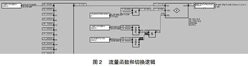 但是由于近期趨勢可能收集不到部分負荷段的相關(guān)數(shù)據(jù),在超出現(xiàn)有數(shù)據(jù)負荷的部分應(yīng)采取必要的補救措施,可以參考相同負荷運行的另一臺余熱鍋爐的主蒸汽流量,以此來彌補現(xiàn)有數(shù)據(jù)的不足。為了保證數(shù)據(jù)切換的可靠性,切換條件要嚴謹,現(xiàn)有函數(shù)的負荷下線上增加25MW與另外一臺的燃機負荷大于100MW。如此設(shè)置的好處是當(dāng)另一臺運行機組突然故障或跳機時保證數(shù)據(jù)能及時切換到函數(shù)輸出,保證機組的安全運行。具體操作見圖2。