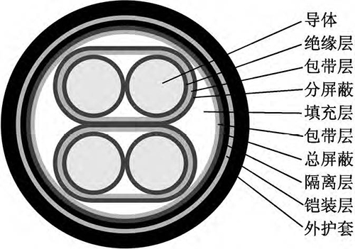 該新型電纜的結構如圖1所示。導體為單股退火鍍錫軟銅線,以提高導體的導電性和防腐蝕性。在導體外繞包一層?。疲矗ň鬯姆蚁┌雽щ妿?,有利于降低導體和絕緣之間的摩擦起電噪音。絕緣采用材料較為純凈、介電常數較小、具有一定彈性的聚丙烯絕緣級材料,并采用擠壓式擠出,減小絕緣層與導體的間隙。采用對絞組作為信號傳輸線,由于在兩根傳輸線上感應的電壓接近相等,減小了電壓差值,提高了信號傳輸穩(wěn)定性;對絞組由兩種不同顏色絕緣線芯組成,相鄰線對對絞節(jié)距應不大于100mm。對絞分屏蔽組(即對對絞組進行分屏蔽,每對對絞組外繞包兩層聚酯帶和一層厚0.04mm鋁塑復合帶繞包,內置一根7×0.26mm鍍錫銅絞線作引流線)有利于對不同對絞組之間信號串音的抑制和隔離。對絞分屏蔽組同心式絞合成纜,在對絞分屏蔽組間填充非吸濕性材料,以保證纜芯圓整。在成纜纜芯外繞包兩層聚酯帶,再采用鋁塑復合帶繞包,內置鍍錫銅線作引流線,以提高電纜電磁屏蔽能力??偲帘螌油鈹D包隔離層(隔離護套),隔離層采用絕緣級低密度聚乙烯材料。隔離層外采用鎧裝層,鎧裝材料為高導磁合金鋼帶,其為強磁材料,可將外來的磁通大部分限制在鎧裝層的外表面上(僅有少部分能進入被屏蔽的空間);鎧裝時對高導磁合金鋼帶采用縱包焊接,確保其形成一連續(xù)圓柱管;鎧裝層可提高電纜抗電磁干擾水平以及對電纜進行加強,減少電纜振動引起的電動勢。外護套采用藍色軟PVC(聚氯乙烯)護層級電纜材料擠包,實現電纜防護。