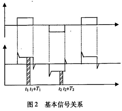 腐蝕性污水流量計(jì)一般都采用工頻交流電源供電,其電源電壓的幅值和頻率的變化都會(huì)給腐蝕性污水流量計(jì)帶來電源性干擾噪聲。對電源電壓的幅值變化,因采用多級(jí)集成穩(wěn)壓,一般而言電源電壓的幅值變化對電磁流量的測量精度影響不大。當(dāng)電源電壓的頻率波動(dòng)時(shí),雖然其波動(dòng)范圍有限,但對腐蝕性污水流量計(jì)測量精度影響較大。為了解決工頻干擾問題,實(shí)現(xiàn)對流體流速感應(yīng)電勢e柚信號(hào)的準(zhǔn)確測量,需利用以下基本關(guān)系:①勵(lì)磁周期為工頻周期的整數(shù)倍,即勵(lì)磁頻率為50/nHz(n為偶數(shù));②正負(fù)勵(lì)磁下的同相位采樣。圖2是對應(yīng)低頻矩形波勵(lì)磁形式下的典型電勢信號(hào)形式,按上述關(guān)系在一個(gè)勵(lì)磁周期下,若假設(shè)t。和t:點(diǎn)為工頻干擾的等效干擾點(diǎn),且采樣寬度T=T1=T2,則e –ab的基本算式為:,