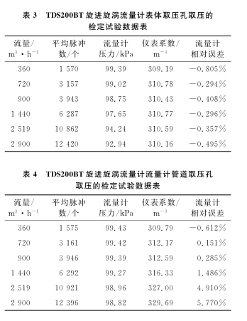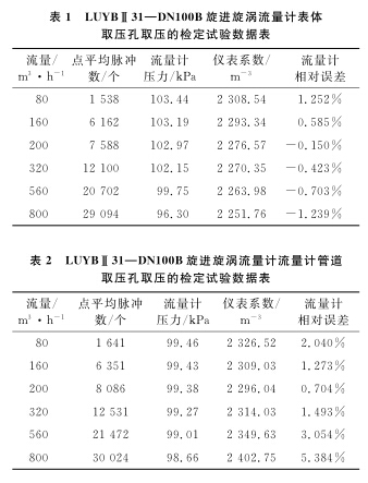 以使用廣泛的DN100B天燃?xì)饬髁坑?jì)為例,系統(tǒng)運(yùn)行時間為60s,標(biāo)準(zhǔn)裝置的滯止平均溫度為28.9℃,空間平均濕度為30%,流量計(jì)的平均溫度為28.3℃,在表體取壓孔取壓和管道取壓孔取壓的流量計(jì)檢定試驗(yàn)數(shù)據(jù)分別如表1、2所示。