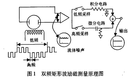 雙頻矩形波勵(lì)磁測量原理如圖l所示,一個(gè)由高低頻分量迭加而成的電磁場通過勵(lì)磁線圈被施加到被測液體中,勵(lì)磁波形是在一個(gè)低頻矩形波上迭加一個(gè)高于市電頻率的矩形波而得到的波形。在產(chǎn)生的電動(dòng)勢中,低頻分量通過一個(gè)大時(shí)間常數(shù)的積分電路獲得一個(gè)零點(diǎn)穩(wěn)定性好的平穩(wěn)流量信號。而由漿液或低電導(dǎo)率流體產(chǎn)生的低頻噪聲可被不受噪聲影響的高頻采樣電路所抑制,有著同樣時(shí)間常數(shù)的流量信號經(jīng)過一個(gè)差分電路以確定流速信號的變化,把這兩種不同頻率采樣所得的信號結(jié)合起來可獲得一個(gè)穩(wěn)定流速信號,該信號不受噪聲干擾,且有較高的零點(diǎn)穩(wěn)定性。