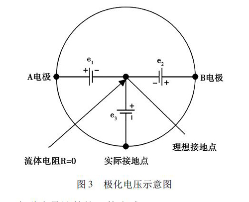 在被測液體與電極和接液部件接觸過程中,電解質中的正負離子會分別作定向運動,這會使被測液體在電極和接液部件之間形成電位差,通常將這種現(xiàn)象稱為極化現(xiàn)象。如圖3 所示,理論上來說,兩電極A 和B 對接液部件的電位e1、e2大小相等、方向相反,此時兩電極的電位差等于零。但是,若兩電極的材質或表面狀態(tài)存在差異,此時A、B 電極之間的電位差就不為零,這就形成了極化電壓,極化電壓與共模狀態(tài)的電壓e3一起疊加在流量信號中,被輸入轉換器的差動放大器。當極化電壓過大,則會對差動放大器的輸入端造成較大影響,導致信號無法放大或流量信號的輸出波動過大,從而降低了鹽水流量計的測量精度。