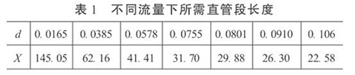 3.直管段長度和成品油流量計精度的初步預測在工程設計中,根據(jù)流體性質(zhì)、流量和雷諾數(shù)確定α和d值。這樣,按照式(5)就可以依不同的流量計精度要求,對直管段長度進行初步預測,或確定直管段長度后,對流量計的精度做初步預測。當δ= 0.2%時,不同流量下所需直管段長度見表1。
