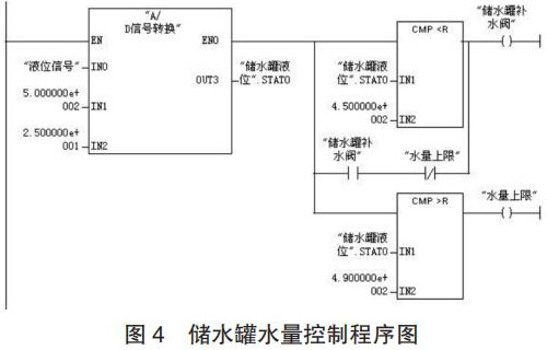 (2)程序設(shè)計(jì)。儲(chǔ)水罐水量控制的工作過(guò)程為:當(dāng)壓力變送器檢測(cè)到儲(chǔ)水罐的水量低于 450kg 時(shí),補(bǔ)水閥 3 開啟為儲(chǔ)水罐補(bǔ)水;當(dāng)水量達(dá)到 490kg 時(shí),補(bǔ)水閥 3 關(guān)閉;生產(chǎn)配制過(guò)程中,循環(huán)以上控制過(guò)程。儲(chǔ)水罐水量控制的程序如圖 4 所示。