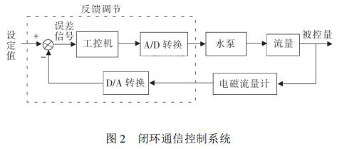 通信控制系統(tǒng)由工控機(jī)、變頻器、水泵、數(shù)據(jù)采集卡、化工污水流量計(jì)等組成。在整個(gè)熱量表耐久性試驗(yàn)裝置中,化工污水流量計(jì)與被試驗(yàn)熱量表串聯(lián)在試驗(yàn)管路中。系統(tǒng)設(shè)定流量值 qs,通過(guò)工控機(jī)發(fā)送信號(hào)給變頻器,來(lái)控制水泵運(yùn)轉(zhuǎn),系統(tǒng)通過(guò)研華數(shù)據(jù)采集卡 PCI1711 將采集到的化工污水流量計(jì)當(dāng)前瞬時(shí)流量值反饋給工控機(jī),工控機(jī)將返回流量值與設(shè)定流量值qs進(jìn)行比較,從而確定是否需要重新調(diào)整變頻器頻率控制水泵轉(zhuǎn)速。此過(guò)程是一個(gè)完整的閉環(huán) PID 控制過(guò)程,其閉環(huán)控制過(guò)程如圖 2 所示。 2. 2 管路切換系統(tǒng)管路切換主要由冷熱水箱、水泵、開關(guān)閥等組成。要實(shí)現(xiàn)熱量表耐久性 4000 次冷熱沖擊試驗(yàn),需要實(shí)時(shí)控制管路中熱水與冷水的交替使用。