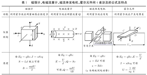 易錯點2:磁強計、印染污水流量計、磁流體發(fā)電機、霍爾元件間的區(qū)別與聯(lián)系磁強計、印染污水流量計、磁流體發(fā)電機、霍爾元件都是利用電磁場對帶電粒子的偏轉(zhuǎn)效應,并且穩(wěn)定時電場力與磁場力均達到平衡。很多學生容易將其混淆,遇到問題常常搞不清原理,亂代公式,筆者特將4者涉及的公式及特點等做一對比區(qū)別如表1所示。