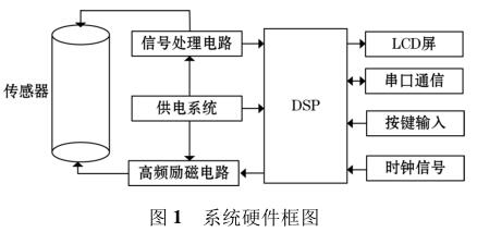 高頻勵磁防腐型電磁流量計由傳感器、高頻勵磁電路、信號處理電路等組成,其中高頻勵磁電路決定著傳感器磁場的強弱,勵磁電路的穩(wěn)定性以及精確性決定著系統(tǒng)檢測的準(zhǔn)確性以及穩(wěn)定性。DSP 系統(tǒng)控制勵磁電路激勵傳感器線圈,當(dāng)線圈中有導(dǎo)電液體流過時,其切割磁感線并在傳感器兩端的線圈上產(chǎn)生感應(yīng)電動勢,利用信號檢測電路監(jiān)測感應(yīng)電動勢的大小,*后根據(jù)相應(yīng)關(guān)系計算出液體的流量,系統(tǒng)硬件框圖如圖 1 所示。