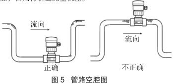 測(cè)量流向取決于高壓電磁流量計(jì)的安裝方位,將高壓電磁流量計(jì)在接頭上旋轉(zhuǎn) 180 度即可反向。正流向時(shí),高壓電磁流量計(jì)的突耳應(yīng)在上游方向。流量顯示總是正的,而累加器可以根據(jù)流向增加或者減少。安裝中確認(rèn)管路設(shè)計(jì)不允許在介質(zhì)中產(chǎn)生氣泡或空腔,否則將引起測(cè)量誤差(見圖 5)。