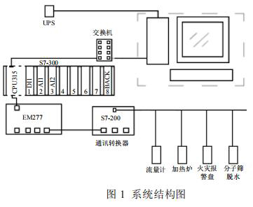集氣站是收集氣井所生產(chǎn)天然氣的站場(chǎng),在集氣站內(nèi)對(duì)天然氣進(jìn)行節(jié)流降壓、加熱、調(diào)壓計(jì)量等各種工藝預(yù)處理,設(shè)備眾多且分散。為方便進(jìn)行檢測(cè)和操作,必須進(jìn)行統(tǒng)一的數(shù)據(jù)采集,在監(jiān)控臺(tái)進(jìn)行數(shù)據(jù)的管理。集氣站設(shè)備主要包括加熱爐、高壓型電磁流量計(jì)、分子篩、火災(zāi)報(bào)警盤(pán),以及供電設(shè)備 UPS 等,這些不同廠(chǎng)家的設(shè)備基本都支持Modbus 協(xié)議,通過(guò) Modbus 通訊可以將這些數(shù)據(jù)采集。為了有效降低成本,設(shè)計(jì)了如圖 1 所示的系統(tǒng)。系統(tǒng)采用西門(mén)子 S7-300 控制器,通過(guò)以太網(wǎng)連接上位機(jī)監(jiān)控軟件,再通過(guò) MP277 連接S7-200 的方式。S7-200 控制器自帶 RS485 接口,能夠進(jìn)行 Modbus 通訊,采集現(xiàn)場(chǎng)各種設(shè)備數(shù)據(jù)。*后通過(guò)以太網(wǎng)通訊將設(shè)備數(shù)據(jù)上傳至監(jiān)控軟件,方便操作人員進(jìn)行監(jiān)控,該方案簡(jiǎn)單有效,能夠?qū)崿F(xiàn)集氣站內(nèi)設(shè)備的狀態(tài)監(jiān)控,數(shù)據(jù)處理,有效的進(jìn)行天然氣的生產(chǎn)工作。