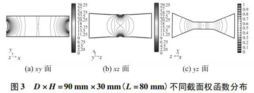 4) 圖 3( c) 、圖 4( c) 的 yz 面權(quán)函數(shù)分布表明,D = 90 mm時的權(quán)函數(shù)等勢線間距略大于 D = 60 mm 時的權(quán)函數(shù)等勢線間距,權(quán)函數(shù)變化梯度較小,且中心區(qū)域的權(quán)函數(shù)等勢線逐漸變?yōu)橹本€,因此 D = 90 mm 的權(quán)函數(shù)分布更均勻一些,但是兩者區(qū)別很小,即寬度改變對 yz 面權(quán)函數(shù)分布影響很小。圖 4( c) 、圖 5( c) 的 yz 面權(quán)函數(shù)分布表明,H = 30 mm時的權(quán)函數(shù)等勢線間距較大,且中心區(qū)域的權(quán)函數(shù)等勢線逐漸變?yōu)橹本€,因此 H = 30 mm 的權(quán)函數(shù)分布更加均勻;