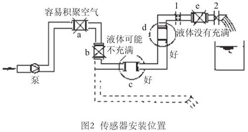 液體流動方向必須與傳感器殼體上箭頭方向一致。對于能正反向測量的液氮流量計,若方向不一致雖仍可測量,但設(shè)定的顯示流動正反方向不符,必須改正之。若拆傳感器工作量大,也可改變傳感器上箭頭方向和重新設(shè)定顯示儀表符號。管道未充滿液體主要是管網(wǎng)工程設(shè)計或傳感器安裝位置不妥,使傳感器測量管內(nèi)不能充滿液體。應(yīng)采取措施,避免安裝如圖2所示a,e位置和以虛線管排放時b位置,改裝到c,d位置。