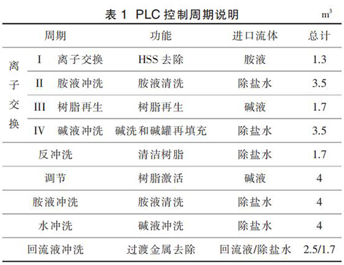 APU 的運行按照事先設定的程序運行,即嚴格遵循設定的步驟順序。 APU 的正確運行依賴于每個步驟的順利完成。 按照預先設定好的步驟完成 1 個任務即視為完成 1 個 APU 運行的“周期”。 離子交換的主周期被稱為“離子交換周期”。除此之外,整個控制程序還包含另外 5 個輔助周期, 分別為反沖洗周期、調(diào)節(jié)周期、胺液沖洗周期、水沖洗周期、回流液沖洗周期。 這 5 個周期在維護和非計劃停車后重新啟動時使用。 PLC 控制各個周期的說明見表 1。