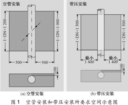 (1)要確認(rèn)在用智能液體流量計(jì)的管壁厚度及內(nèi)襯材料特性,保證換能器在管段內(nèi)壁的突出長(zhǎng)度;(2)用氣焊切割智能液體流量計(jì)外殼時(shí),一定要在管道內(nèi)充滿(mǎn)水的情況下(*好是帶壓并繼續(xù)保持管內(nèi)水在運(yùn)行流動(dòng)的狀態(tài))進(jìn)行,以免內(nèi)襯受熱凸起變形影響流態(tài);(3)要有足夠安裝空間(流量井),可以用原有的流量井,但管壁與流量井墻壁*小距離不小于 500 mm,流量井長(zhǎng)不小于 1. 5 倍管徑。超聲波流量計(jì)空管安裝和帶壓安裝要求空間如圖 1 所示。