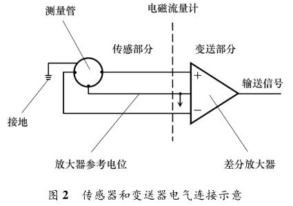 液體流量計(jì)主要由兩部分組成:流量傳感器和信號(hào)變送器,如圖 2 所示。傳感器上的勵(lì)磁線圈接受變送器傳輸來(lái)的勵(lì)磁電流產(chǎn)生磁場(chǎng),輸出感應(yīng)電動(dòng)勢(shì)信號(hào);信號(hào)變送器則將感應(yīng)電動(dòng)勢(shì)信號(hào)轉(zhuǎn)換為流量信號(hào)或模擬量信號(hào)送至控制系統(tǒng)。液體流量計(jì)按組成方式分為一體式和分體式。液體流量計(jì)穩(wěn)定工作另外一個(gè)重要條件是接地。當(dāng)流體流動(dòng)穿過(guò)磁場(chǎng)時(shí),以導(dǎo)電流體本身作為參考電位,在測(cè)量管一側(cè)電極產(chǎn)生正電勢(shì),另一側(cè)產(chǎn)生負(fù)電勢(shì),形成電勢(shì)差。但此電動(dòng)勢(shì)信號(hào)一般只有幾毫伏,易受外界干擾。為防止干擾,將參考電位接入大地作為零電位,保證傳感器輸出精確穩(wěn)定的信號(hào)。傳感器和轉(zhuǎn)換器的接地端必須與被測(cè)介質(zhì)同電位,才能構(gòu)成對(duì)稱的輸入輸出回路。