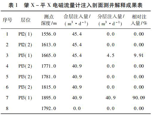 2017 年 9 月在大慶油田采油八廠肇 X - 平 X 水平井注水井中*次進(jìn)行了水平井注入剖面測(cè)井現(xiàn)場(chǎng)試驗(yàn)。該井斜深2 055. 42 m,水平段長(zhǎng)度為568. 46 m,試驗(yàn)?zāi)康氖峭ㄟ^注入剖面測(cè)井了解該井各層段的注水情況,同時(shí)對(duì)水平井測(cè)井工藝、儀器的適用性、井下牽引器及井口輔助裝置等設(shè)備的工作有效性和可靠性進(jìn)行評(píng)價(jià)?,F(xiàn)場(chǎng)試驗(yàn)中,在密閉條件下錄取到了該井的注入剖面測(cè)井資料,進(jìn)行了重復(fù)測(cè)量,重復(fù)測(cè)量結(jié)果在誤差允許范圍內(nèi),測(cè)井成果見表 1。該井施工壓力 6. 0 MPa,注入量45. 4 m3 /d,有 7 個(gè)射孔層,分 8 個(gè)測(cè)點(diǎn)測(cè)量,2 個(gè)層有吸入顯示,其中,P13( 1) ( 1 734 ~ 1 767 m) 層絕對(duì)吸入量4. 5 m3 /d,相對(duì)吸入量為9. 91 %,P13( 1) ( 1 899 ~1 943 m)層絕對(duì)吸入量 40. 9 m3 /d,相對(duì)吸入量為 90. 09% ,測(cè)井成果見表 1。通過與甲方的交流,再結(jié)合該井的動(dòng)靜態(tài)資料及周圍井的工作狀況,采油廠的地質(zhì)人員認(rèn)為本次測(cè)井結(jié)果能比較準(zhǔn)確地反映該井的注入情況。