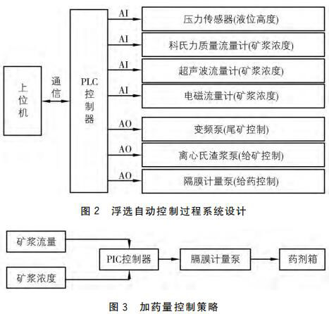 圖3中的礦漿流量與礦漿濃度分別由科氏質(zhì)量流量計和超聲波流量計測得,并 以4~20mA 電流信號傳送給 PLC控制器。由 PLC控制器根據(jù)電流信號值計算出實際的礦漿濃度和礦漿流量值,對上述兩個值進行邏輯處理以及運算,得出實時加藥量。PLC 控制器將計算出的實時加藥量數(shù)據(jù)以4~20mA 的電流信號發(fā)送給隔膜計量泵,由其控制并實現(xiàn)加藥量過程的自動控制。