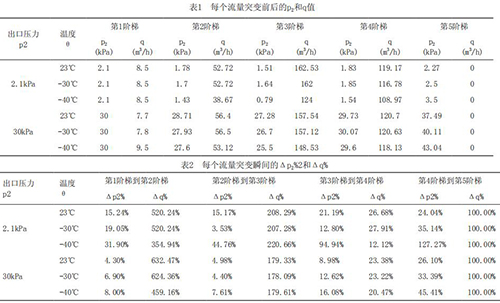 為了深入研究溫度及流量突變對分體式電磁流量計(jì)響應(yīng)速度的影響趨勢,把每個(gè)流量突變點(diǎn)前后的出口壓力p2,流量q列表如表1所示。