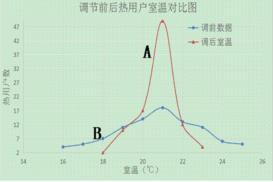 圖3中的曲線 A和B供熱管網(wǎng)渦街氣體流量計(jì)調(diào)節(jié)前后的熱用戶室溫變化情況,橫坐標(biāo)表示室溫分布,縱坐標(biāo)表示熱用戶數(shù)量。從圖中可以看出,渦街氣體流量計(jì)調(diào)節(jié)前熱用戶室溫比較分散,既有室溫小于18℃的熱用戶,也有室溫大于24℃的熱用戶。熱用戶室溫“近熱遠(yuǎn)冷”,供熱管網(wǎng)存在水力不平衡現(xiàn)象。渦街氣體流量計(jì)調(diào)節(jié)后,有49戶用戶室溫在20℃~21℃之間,從圖中可以看出室溫分布范圍縮小,平均室溫降低,從而,不僅減少了供熱量,也大大提高了供熱品質(zhì)。一般來講,對(duì)采暖系統(tǒng),每增加 1℃平均室溫,能耗增多 5%~10%。采暖系統(tǒng)實(shí)現(xiàn)平衡后,常??梢越档推骄覝?℃~3℃。