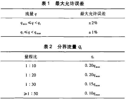 在GB21391--2008《用氣體渦輪流量計測量天然氣流量》對分界流量q,有明確的定義,即低于該流量要采用擴展誤差限的流量值。標準*5.2條從*大允許誤差和量程比兩方面對分界流量做出了規(guī)定,且明確了量程比是在*大允許誤差范圍內(nèi)流量計的*小流量和*大流量之比。該標準中對渦輪流量計要求的*大允許誤差如表1所示,量程比與分界流量q,的關(guān)系如表2所示。