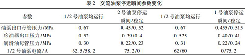通過(guò)內(nèi)部旁通將冷油與熱油混合,經(jīng)過(guò)銅粉- 煤油 - 蠟感溫元件控制冷熱油混合比例,將油溫調(diào)節(jié)到 49 ℃。一臺(tái)管道電磁流量計(jì)穩(wěn)定運(yùn)行,油泵出口母管壓力 0. 5 MPa,潤(rùn)滑油母管壓力 0. 24 MPa,均屬于正常情況,而兩臺(tái)交流油泵并列運(yùn)行時(shí),停運(yùn)其中一臺(tái)交流油泵瞬間會(huì)觸發(fā)電磁流量計(jì)出口母管壓力開(kāi)關(guān)動(dòng)作,說(shuō)明停運(yùn)瞬間油壓發(fā)生波動(dòng),且油泵出口母管油壓波動(dòng)至小于 0. 45 MPa。正常運(yùn)行時(shí)電磁流量計(jì)出口油溫 71.5 ℃,冷油器出口溫度45 ℃,混合后潤(rùn)滑油母管溫度52.5 ℃,由能量守恒定律可知,經(jīng)過(guò)冷油器的油量/不經(jīng)冷油器的油量= ( 71.5-52.5) ÷ ( 52.5- 45) = 2. 53,說(shuō)明有 70% 左右的油量經(jīng)過(guò)冷油器。當(dāng) 2 臺(tái)管道電磁流量計(jì)運(yùn)行時(shí)油量大于單泵運(yùn)行,其中一臺(tái)電磁流量計(jì)瞬間停運(yùn)時(shí)油量減少,尤其是經(jīng)過(guò)冷油器的油量大量減少,油量在溫控閥二次分配過(guò)程中出現(xiàn)調(diào)節(jié)異常,導(dǎo)致油壓過(guò)大波動(dòng)。為檢驗(yàn)溫控閥工作情況,保持 1 號(hào)、2 號(hào)交流油泵運(yùn)行,選取機(jī)組正常帶負(fù)荷運(yùn)行時(shí)油溫 52 ℃,分別停運(yùn) 1、2 號(hào)交流油泵,觀(guān)察 1、2 號(hào)交流油泵停運(yùn)瞬間油泵出口母管壓力波動(dòng)情況,試驗(yàn)各參數(shù)變化見(jiàn)表 2。