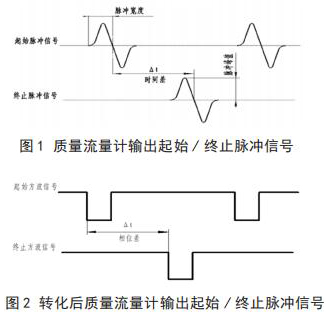 插入式電磁流量計(jì)流量與相關(guān)測試設(shè)備連接起來,就可以進(jìn)行插入式電磁流量計(jì)的校準(zhǔn),時(shí)間差△ t 由專用試驗(yàn)測試設(shè)備可以測出。起始脈沖信號和終止脈沖信號如圖 1 所示。經(jīng)過專用試驗(yàn)測試設(shè)備信號轉(zhuǎn)化后的信號方波如圖 2 所示。
