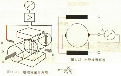 非滿管檢測也是基于電導率檢側(cè)的方法。在圖4.33所示的電磁流量傳感器中,增加了一個(或一對)非滿管檢測電極。當導管內(nèi)液體滿管時,頂部電極與其他電極之間的電阻值很小;而當存在非滿管情況時,頂部電極與導電液體之間有氣體阻隔,所以電極電阻顯著增大,從而做出非滿管判斷。