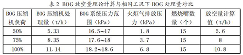 為維持 BOG 系統(tǒng)壓力穩(wěn)定,在正常工況下通過 BOG壓縮機回收 BOG 方式進行,在檢修期間采用火炬放空方式進行。從表 2 中可以看出,在系統(tǒng)壓力維持一定值時,理論計算值與 BOG 壓縮機處理量基本相同,火炬氣放空量 計算方法可行。