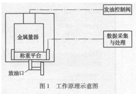 本裝置采用容積法和稱重法相結(jié)合的工作原理。對于質(zhì)量流量計,采用稱量法直接比較,確定流量計的誤差。上裝放油閥防溢出控制系統(tǒng),采用液位動態(tài)監(jiān)視,一旦超過容器安全液位高度,即可切斷發(fā)油動力。在運(yùn)輸防震或非測量狀態(tài)時,對秤進(jìn)行與稱重容器的脫離操作,保證稱重的可靠性。在稱重狀態(tài)時,需要對枰進(jìn)行調(diào)平和清零,此部分采用動態(tài)水平的方式進(jìn)行,即以水平位一致的方法調(diào)整稱重平臺。工作原理如圖1所示。