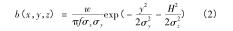 式中: b(x,y,z) = w × e(x,y,z),其中 e(x,y,z) 為二氧化硫濃度與循環(huán)流化床火炬氣流量計煙氣排放源煙氣強度的比例系數(shù);f 為平均風(fēng)速,m/s; w 為地面空氣內(nèi)煙氣排放強度;σ x 為橫向擴散系數(shù)受環(huán)境穩(wěn)定度與下風(fēng)向距離因素的影響程度。式(3)中描述的是基于時間變化的循環(huán)流化床火炬氣流量計煙氣排放源煙氣排放強度計算模型。