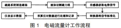 智能渦輪流量計的產(chǎn)生主要是基于法拉*電磁感應定律。在智能渦輪流量計的應用中,磁路系統(tǒng)會在流量計運行過程中逐步出現(xiàn)直流磁場與交流磁場,該磁場的產(chǎn)生為后期的測量提供了良好的前提條件,營造了測量所需的磁場環(huán)境,因此,在智能渦輪流量計應用時,一旦被測液體在導管中經(jīng)過該磁場環(huán)境時,必然會產(chǎn)生一定的切割磁力線運動,在這種情況下,電極傳感器就會發(fā)揮其作用,將導管內(nèi)的流量轉(zhuǎn)換為感應電勢信號,隨后此轉(zhuǎn)換形成的信號逐步被傳遞給轉(zhuǎn)換器。而轉(zhuǎn)換器更是可以將所獲得的流量信號等加以處理,通過分析、對比等,轉(zhuǎn)換器會將該信號變?yōu)闃藴市盘枺S后將該信號輸出給積算儀,進一步進行信號的處理,這些處理以后的信號*終會在智能渦輪流量計的儀表中顯示,呈現(xiàn)*終的流量測量結(jié)果,其基本的流程如圖 1 所示。