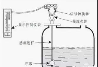 原理: 浮球液位計(jì)結(jié)構(gòu)主要基于浮力和靜磁場(chǎng)原理設(shè)計(jì)生產(chǎn)的。帶有磁體的浮球(簡(jiǎn)稱浮球)在被測(cè)介質(zhì)中的位置受浮力作用影響:液位的變化導(dǎo)致磁性浮子位置的變化。浮球中的磁體和傳感器(磁簧開關(guān))作用,使串連入電路的元件(如定值電阻)的數(shù)量發(fā)生變化,進(jìn)而使儀表電路系統(tǒng)的電學(xué)量發(fā)生改變。也就是使磁性浮子位置的變化引起電學(xué)量的變化。通過(guò)檢測(cè)電學(xué)量的變化來(lái)反映容器內(nèi)液位的情況。