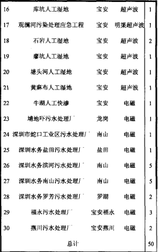 截止目前,深圳市內(nèi)外所有污水處理廠(包括人工濕地、快滲)共計(jì)30余座,重點(diǎn)監(jiān)控的排污流量計(jì)50余臺(tái)。統(tǒng)計(jì)數(shù)據(jù)如下表(見表1)